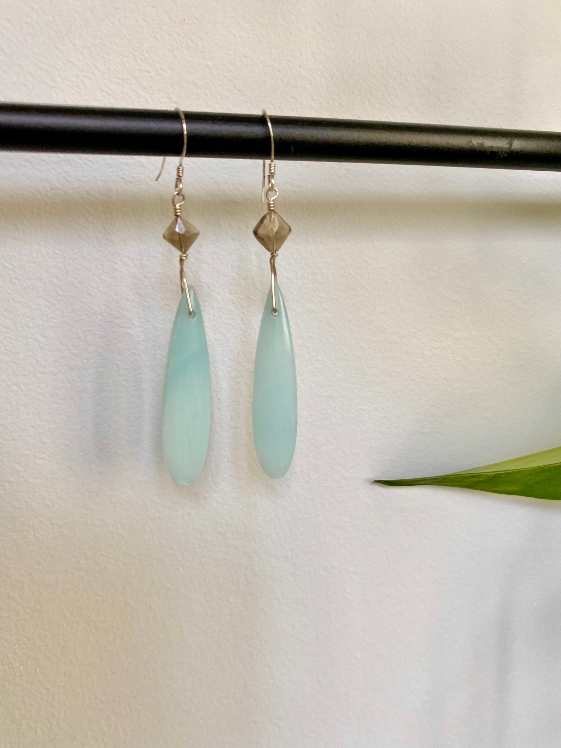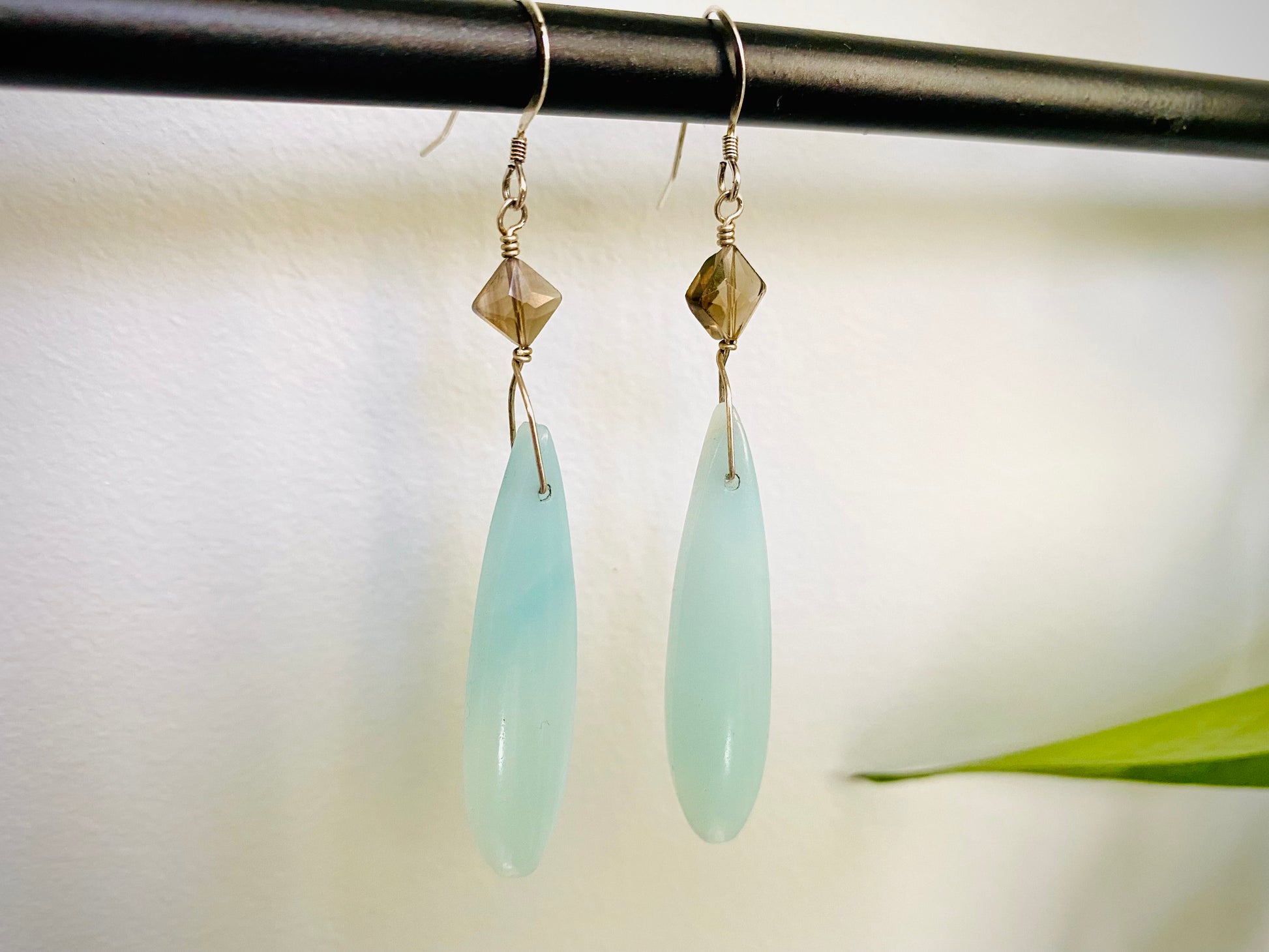 Long Amazonite teardrops, Smoky Quartz faceted diamonds, sterling silver wire and ear wires, 2.5” long.