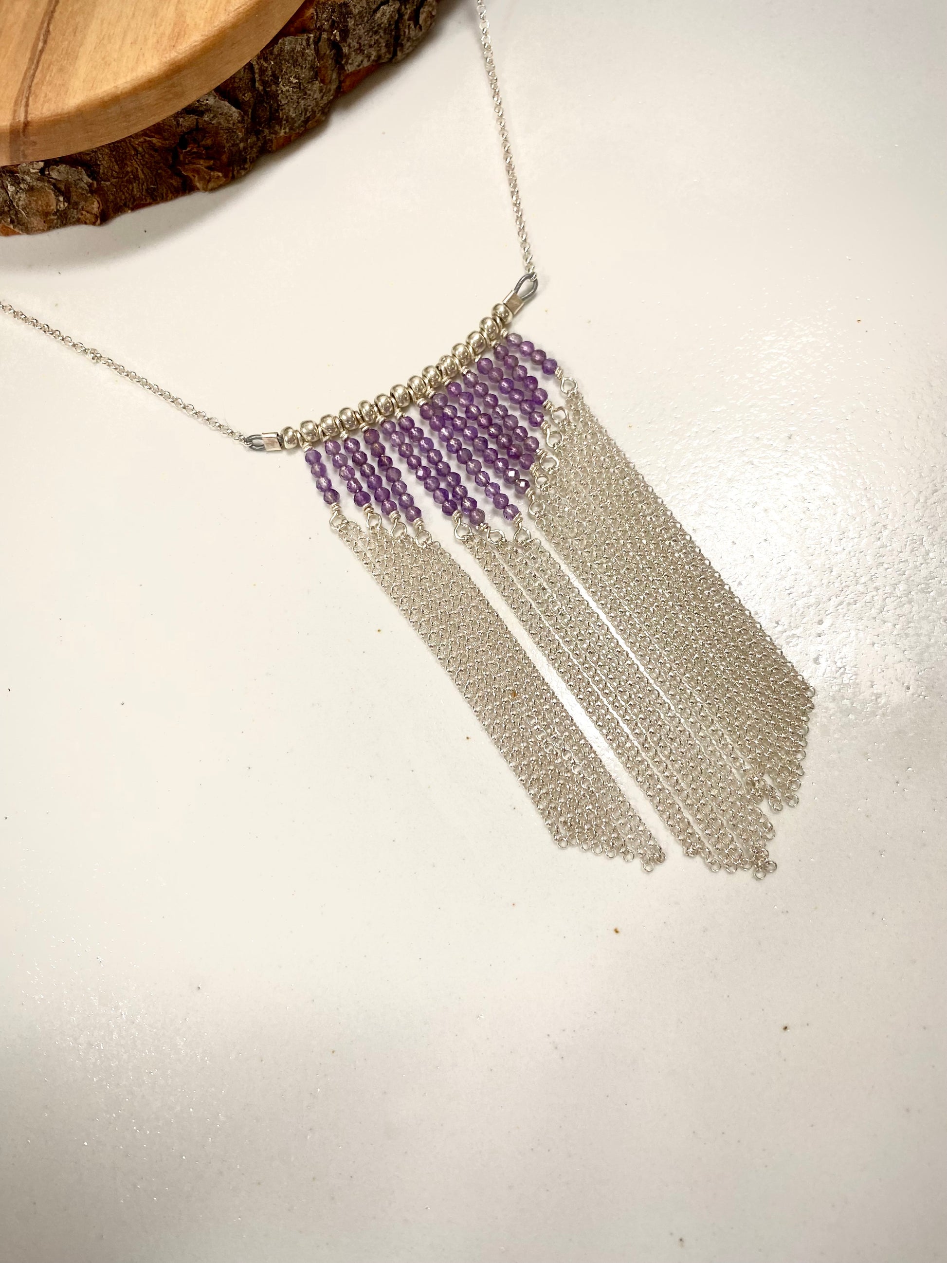 19” long; Amethyst faceted 3mm, bead wire, sterling silver chain, wire, & clasp.
