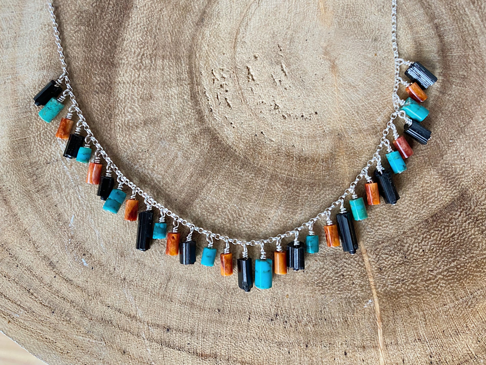 Black Tourmaline, Turquoise, & Coral Fringe Necklace