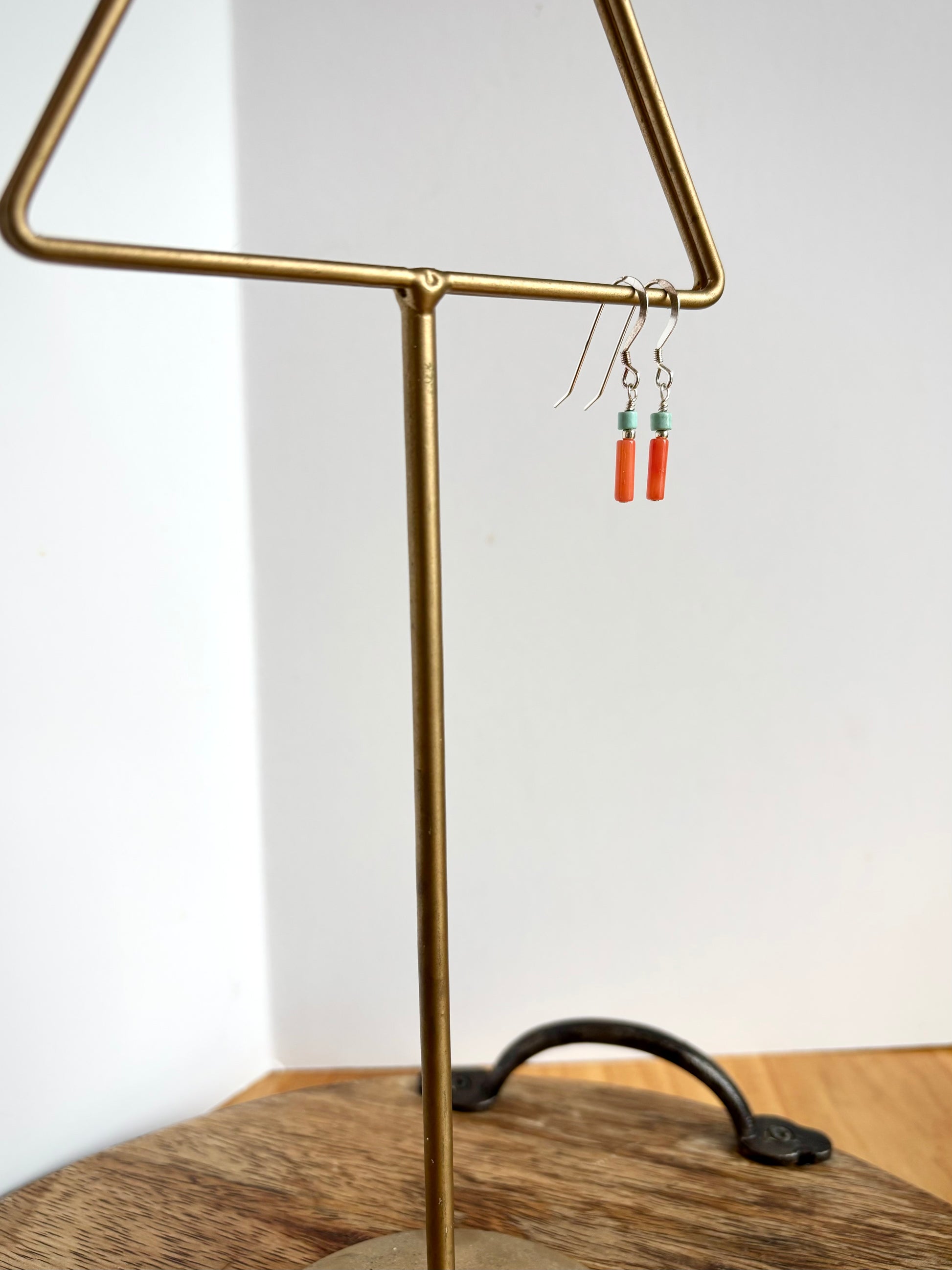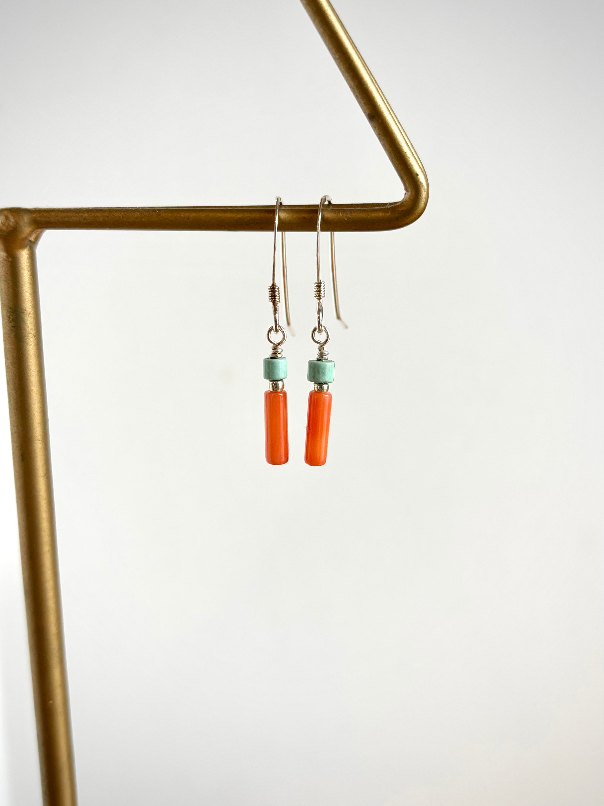 1.25” long, Coral tubes, Turquoise rondelles, sterling silver ear wires.