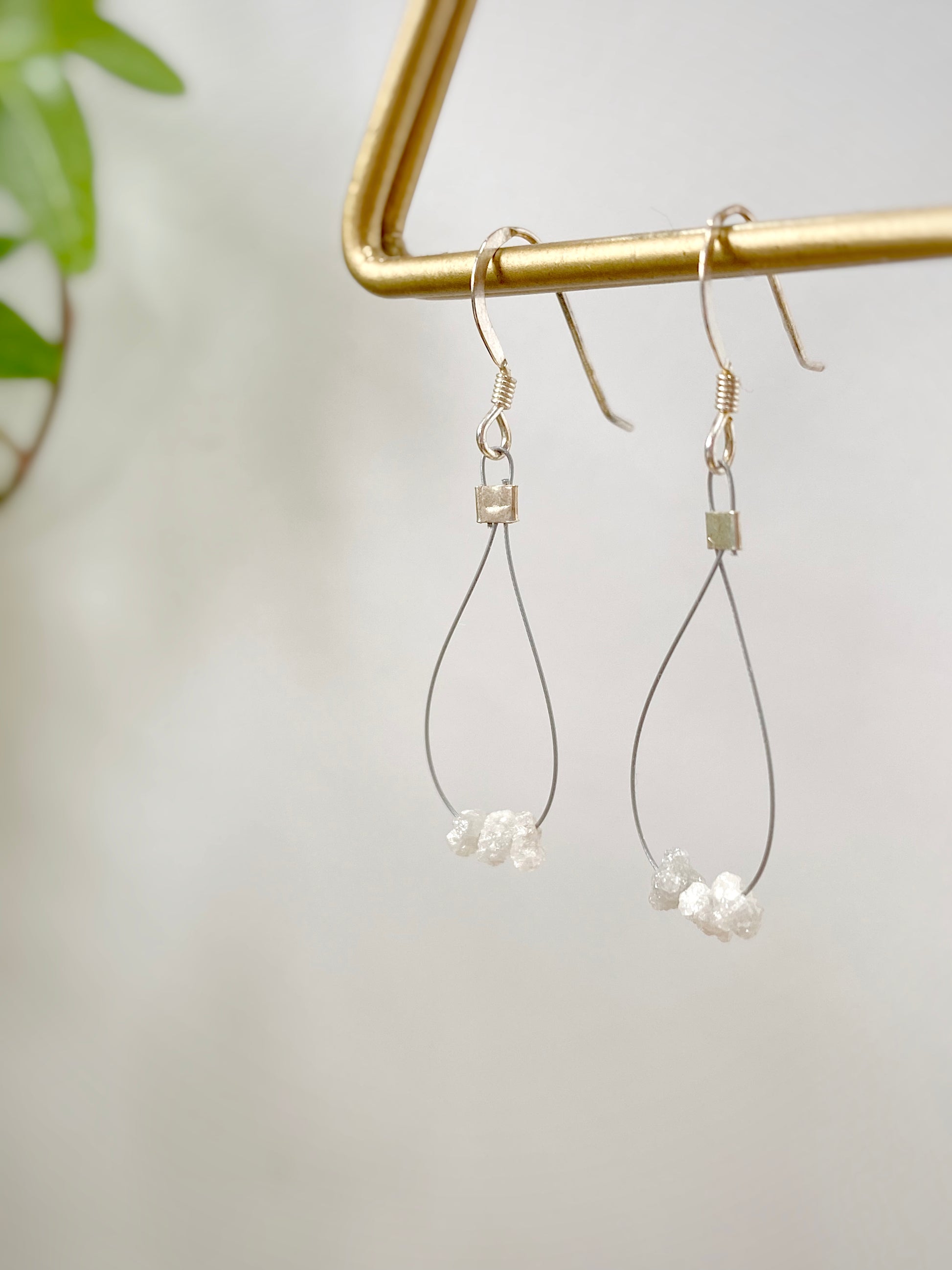 1.5” long; raw Diamonds, bead wire, sterling silver crimps & ear wires.