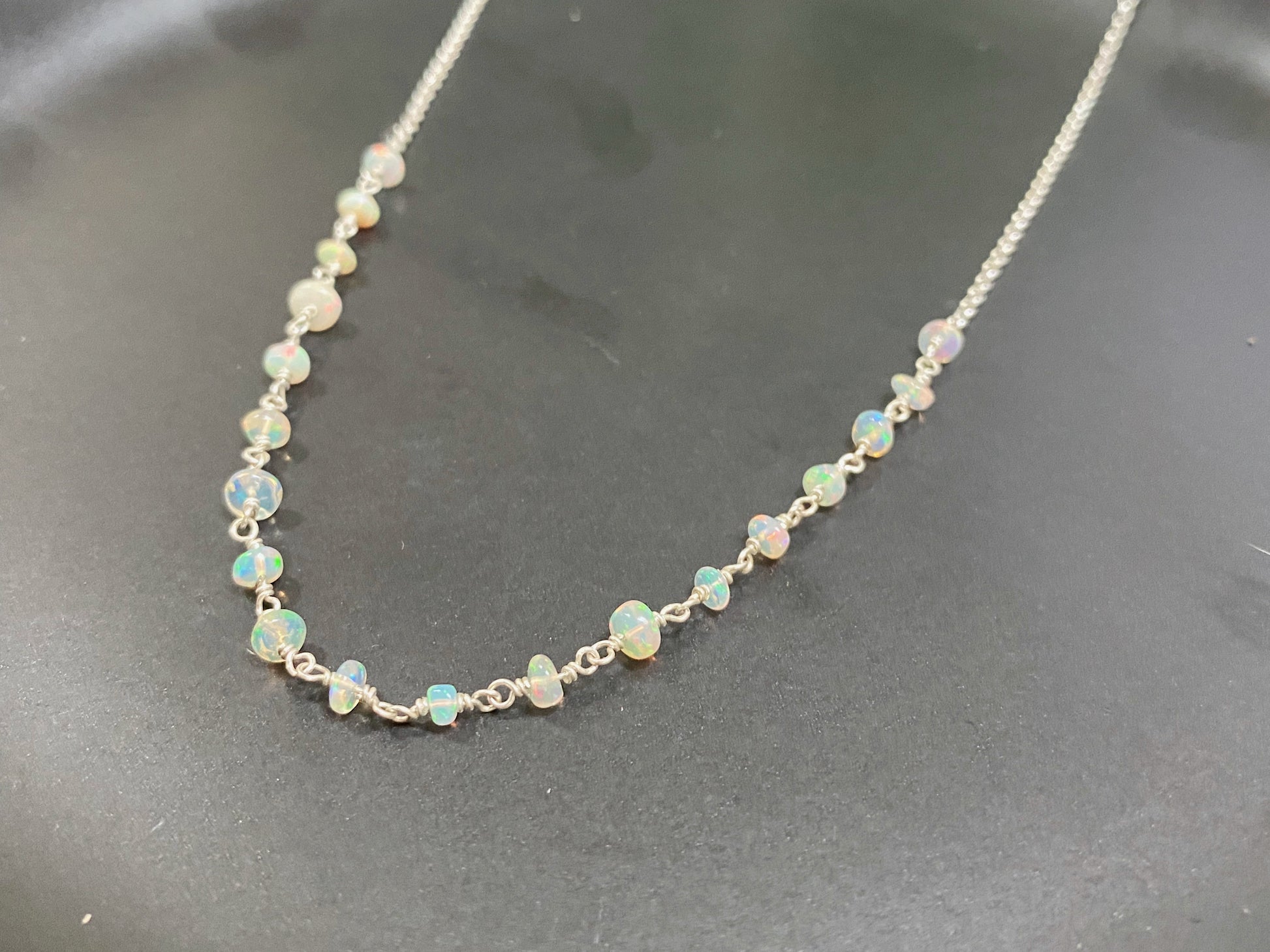 16.5" long, Ethiopian Opal rondelles, sterling silver wire, chain, and clasp.