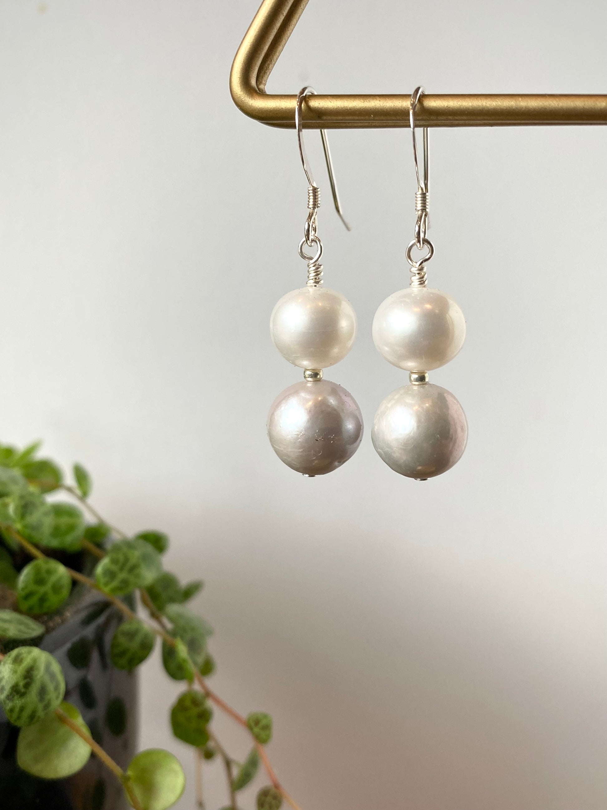 1.5” long, 12mm grey Freshwater Pearls, 10mm white Freshwater Pearls, sterling silver ear wires.