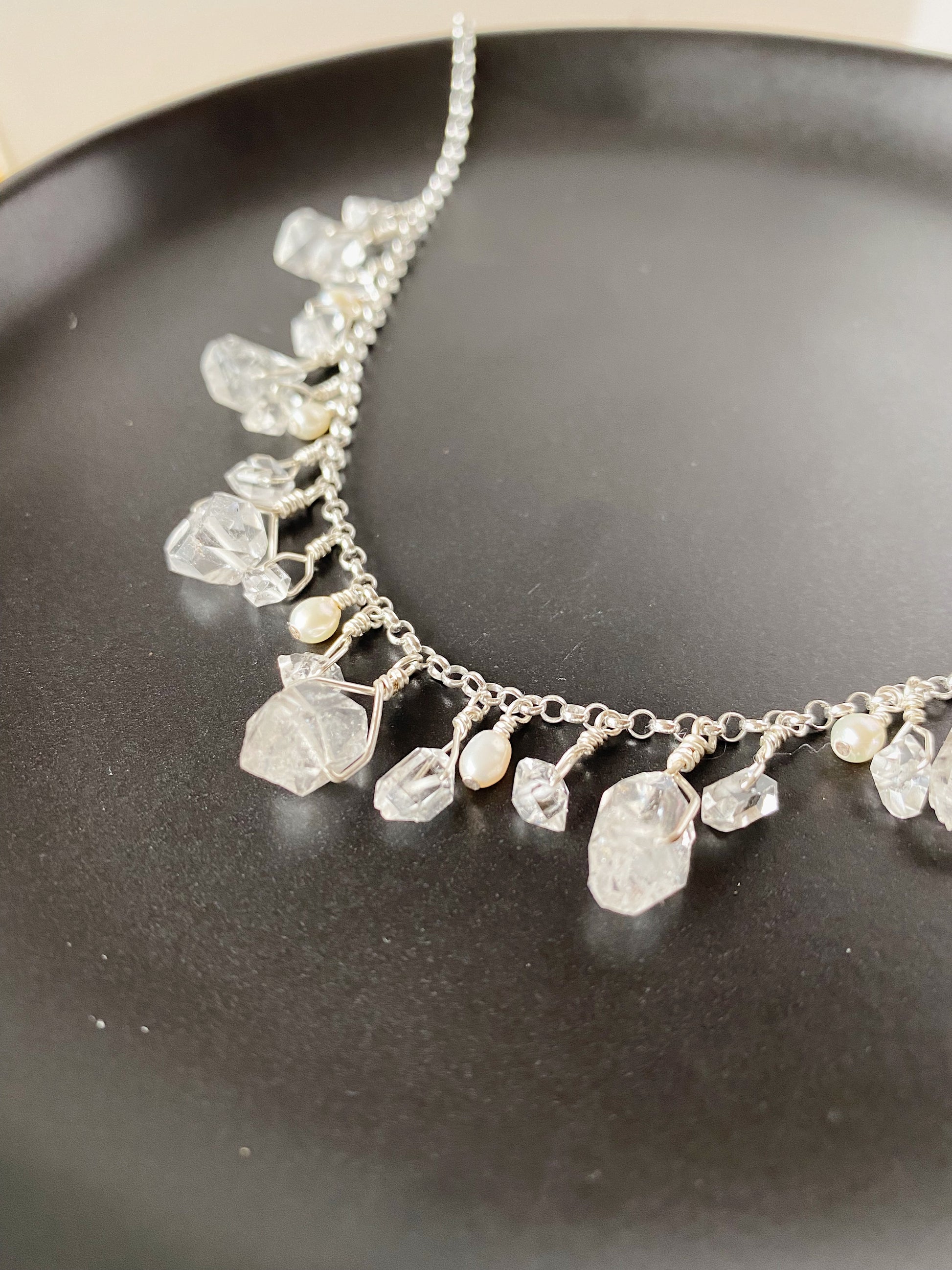 18" long, large and small Herkimer Diamonds, 4mm Freshwater Pearls, sterling silver wire, chain, and clasp.
