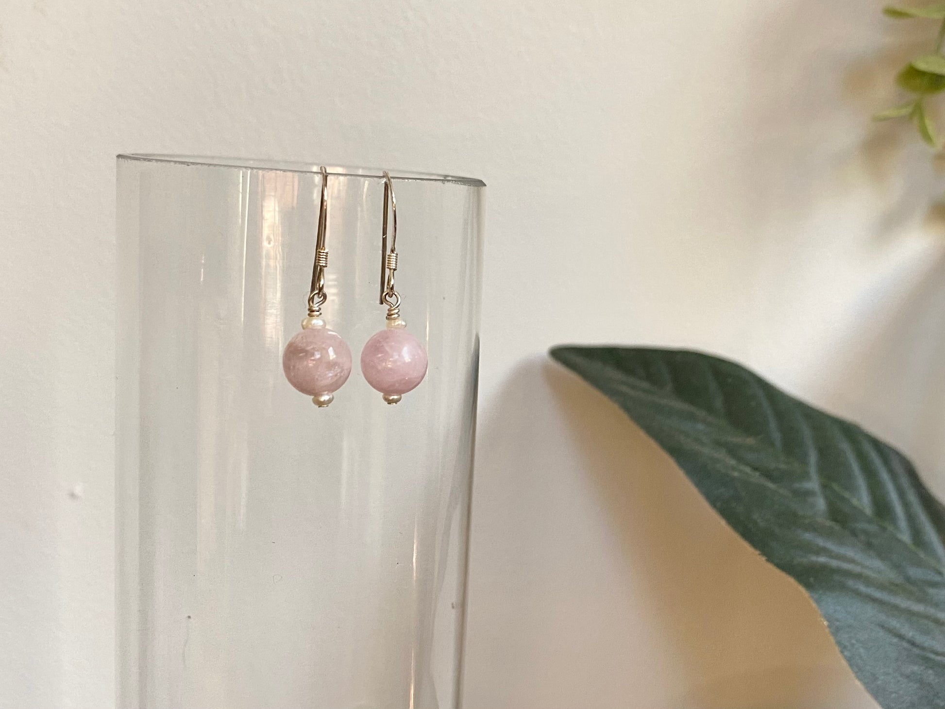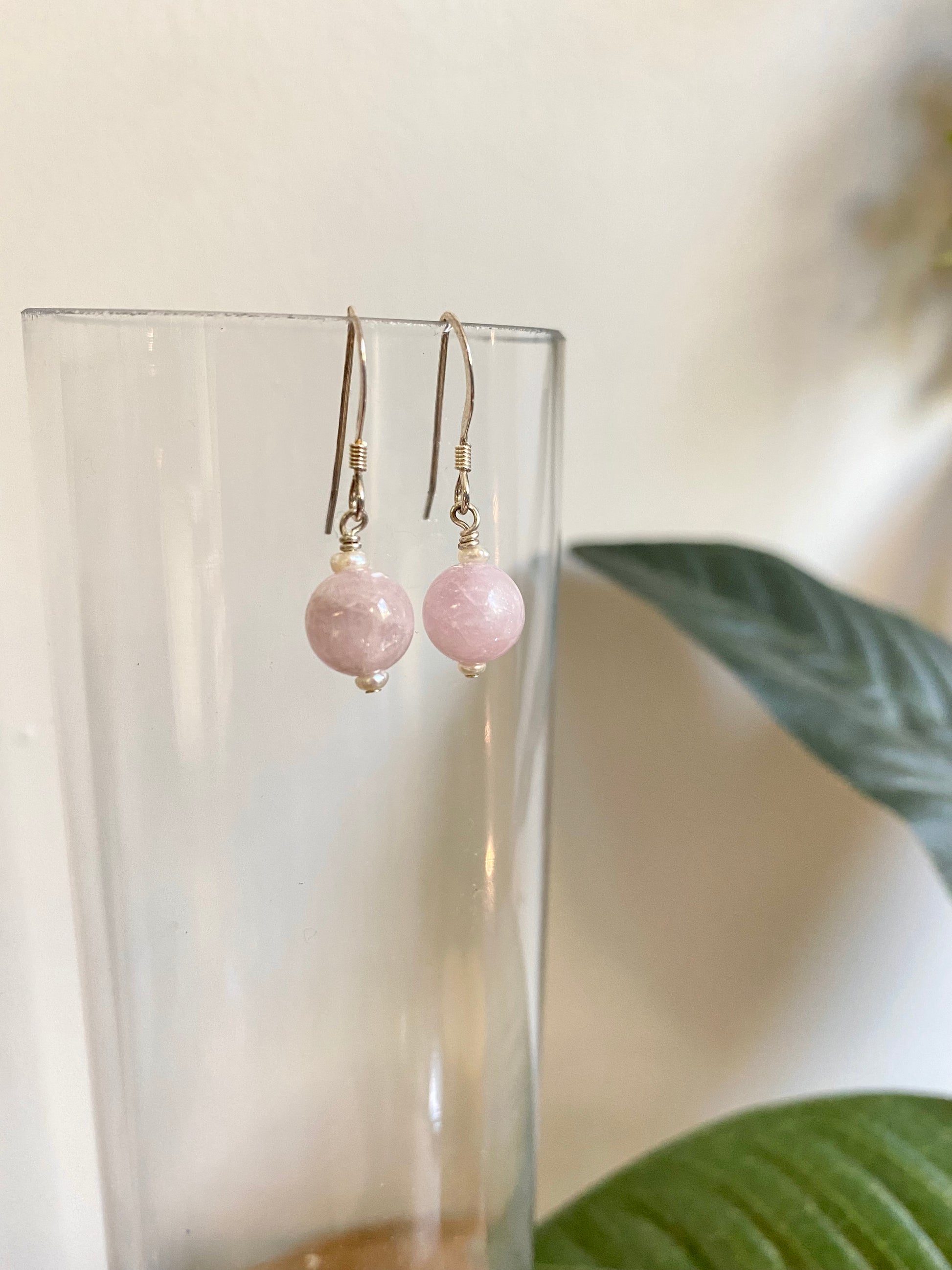 1" long, 8mm Kunzite, 3mm Freshwater Pearl, sterling silver ear wires.