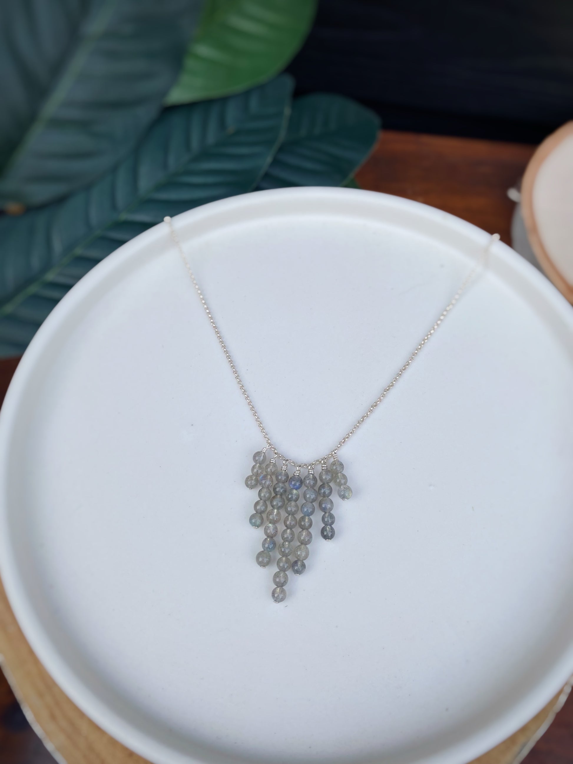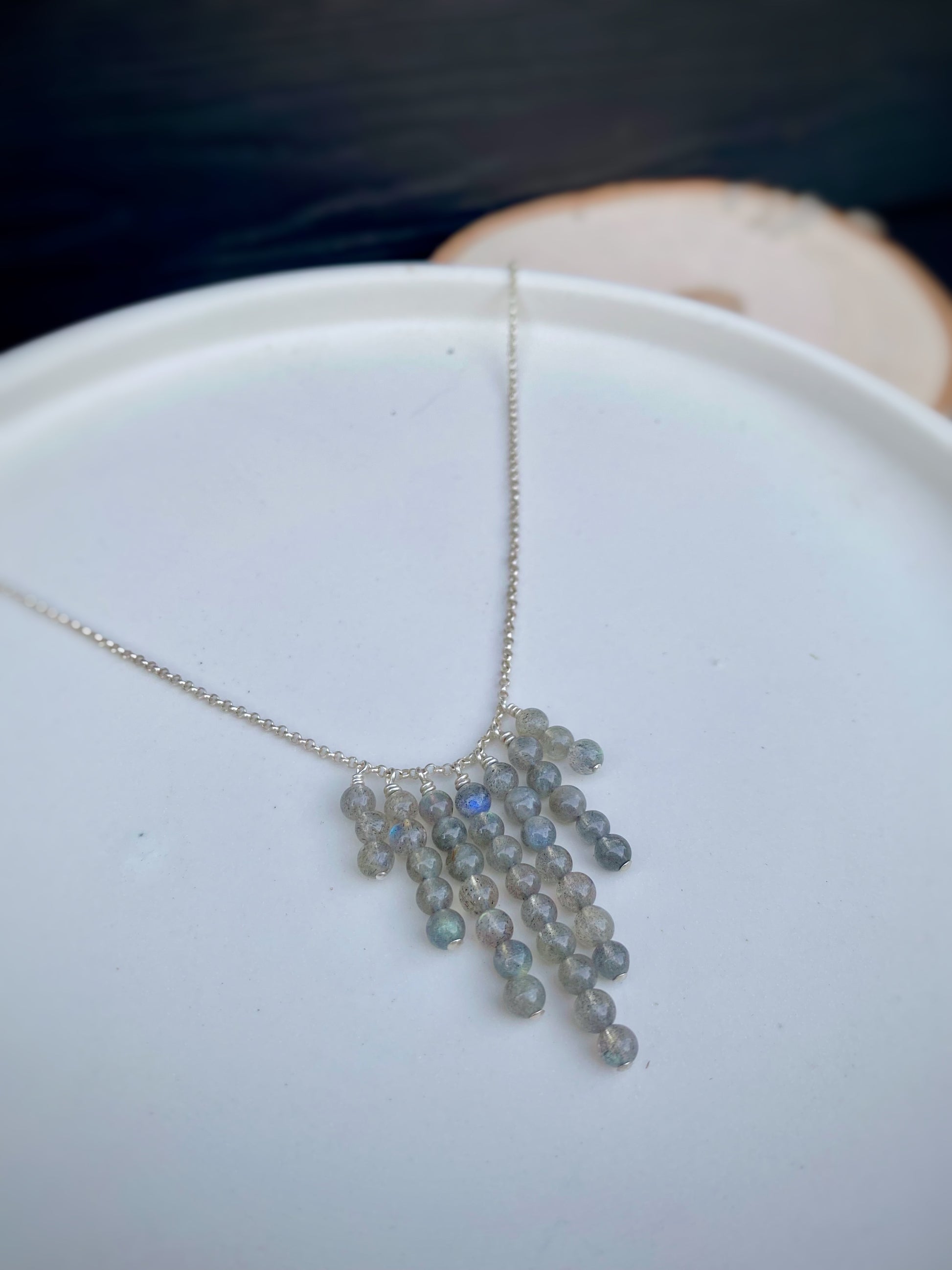 18" long, 4mm Labradorite, sterling silver chain and clasp.
