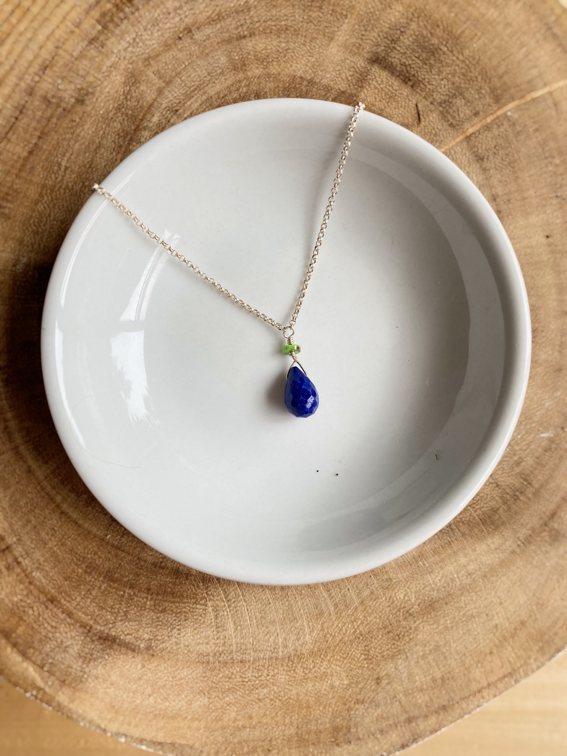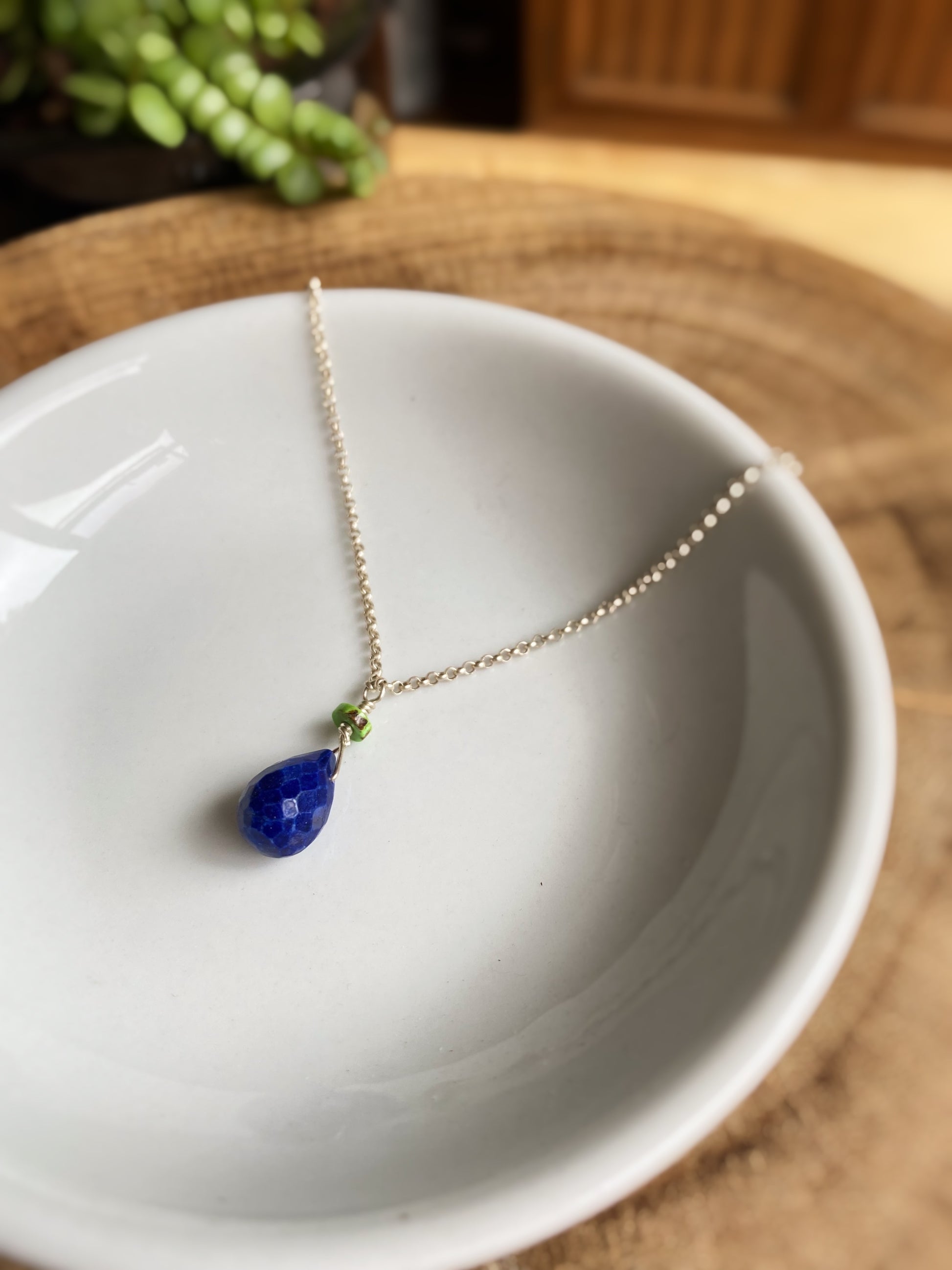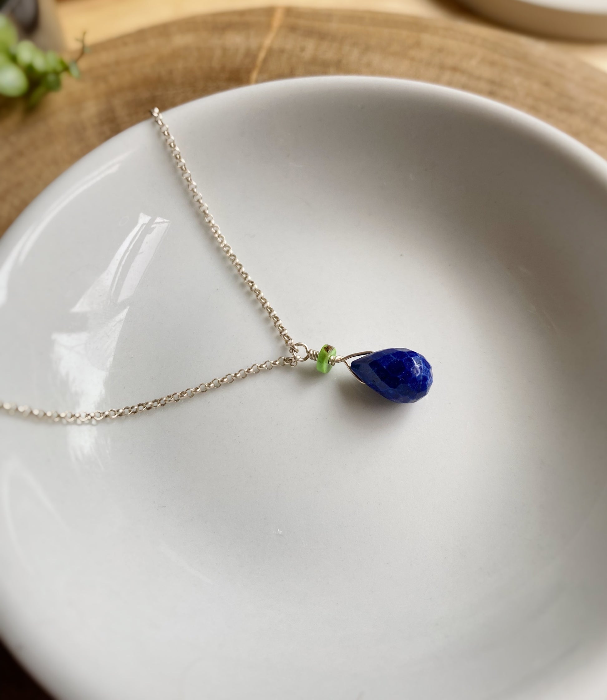 17.5" long, faceted Lapis briolette, Gapeite disc, sterling silver chain, wire, and clasp.