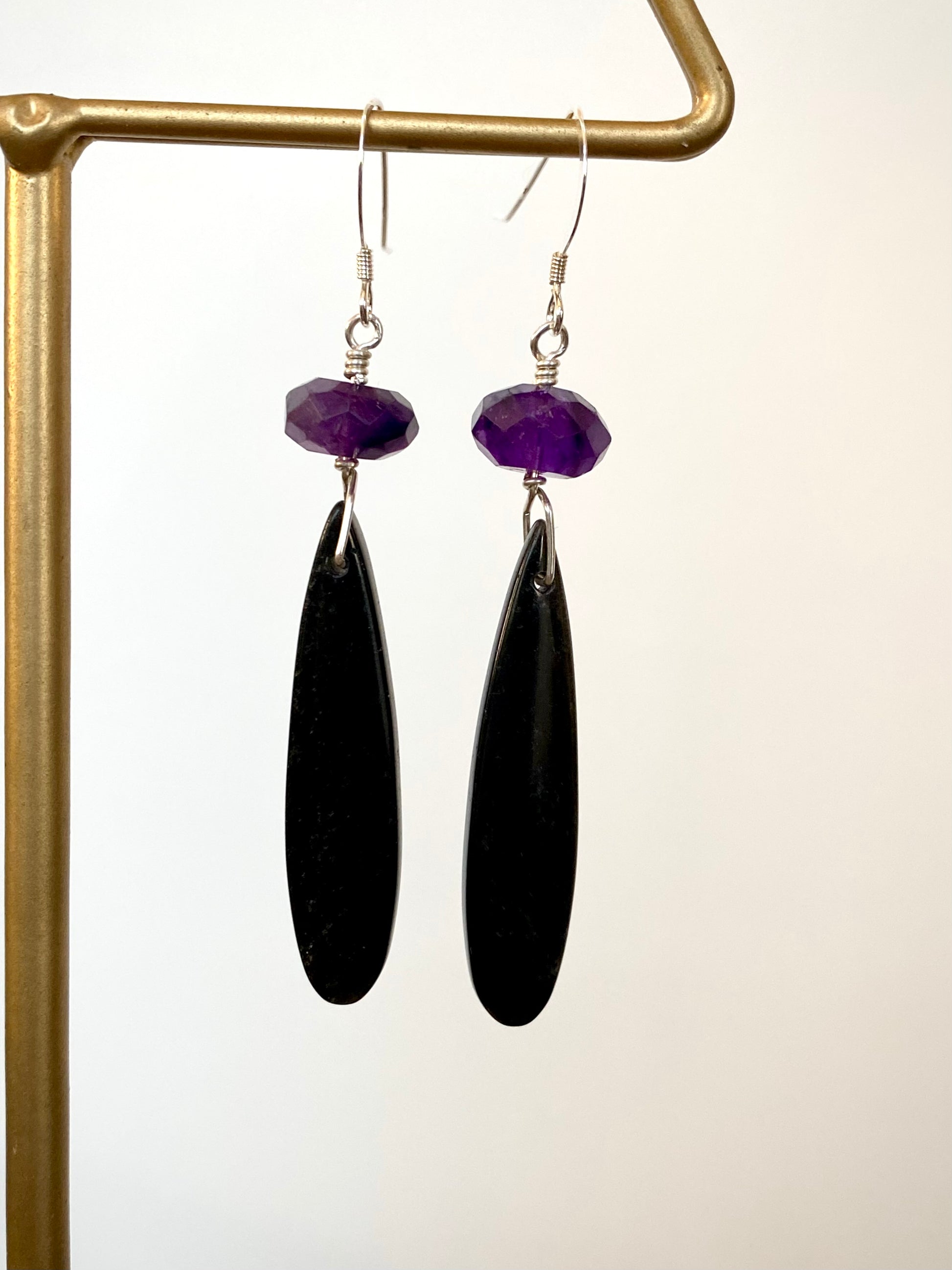3” long, black Obsidian teardrops, Amethyst faceted briolette, sterling silver wire & ear wires.
