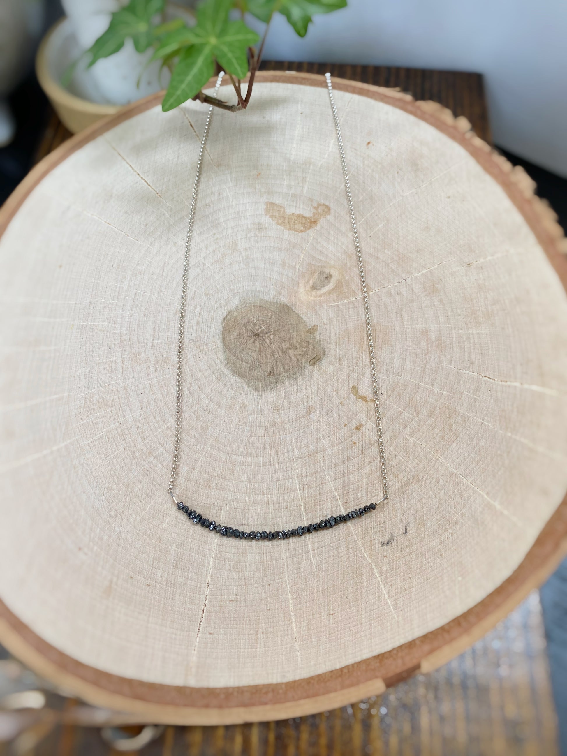 18.5" long, raw black Diamond chunks, sterling silver chain and clasp.