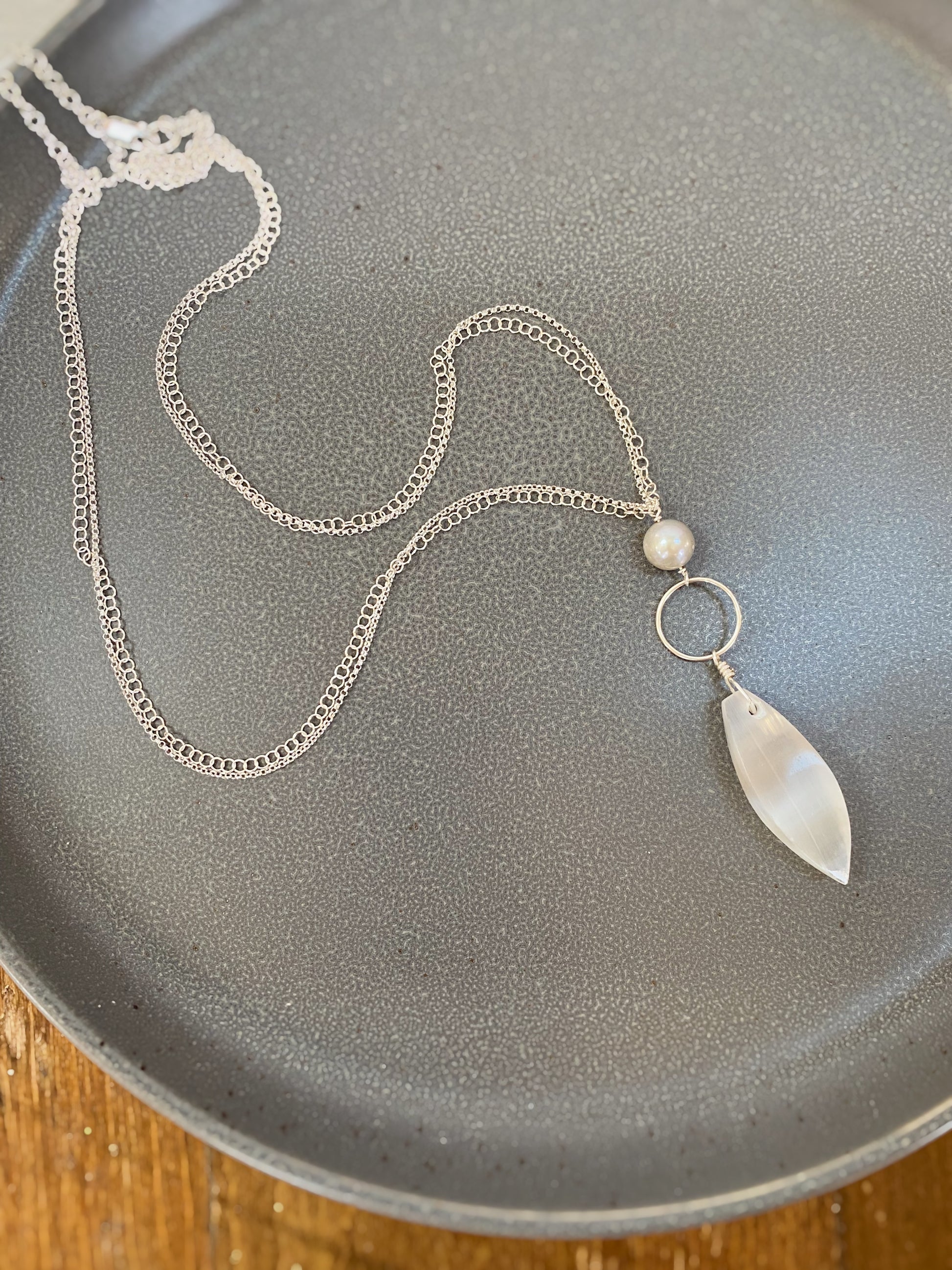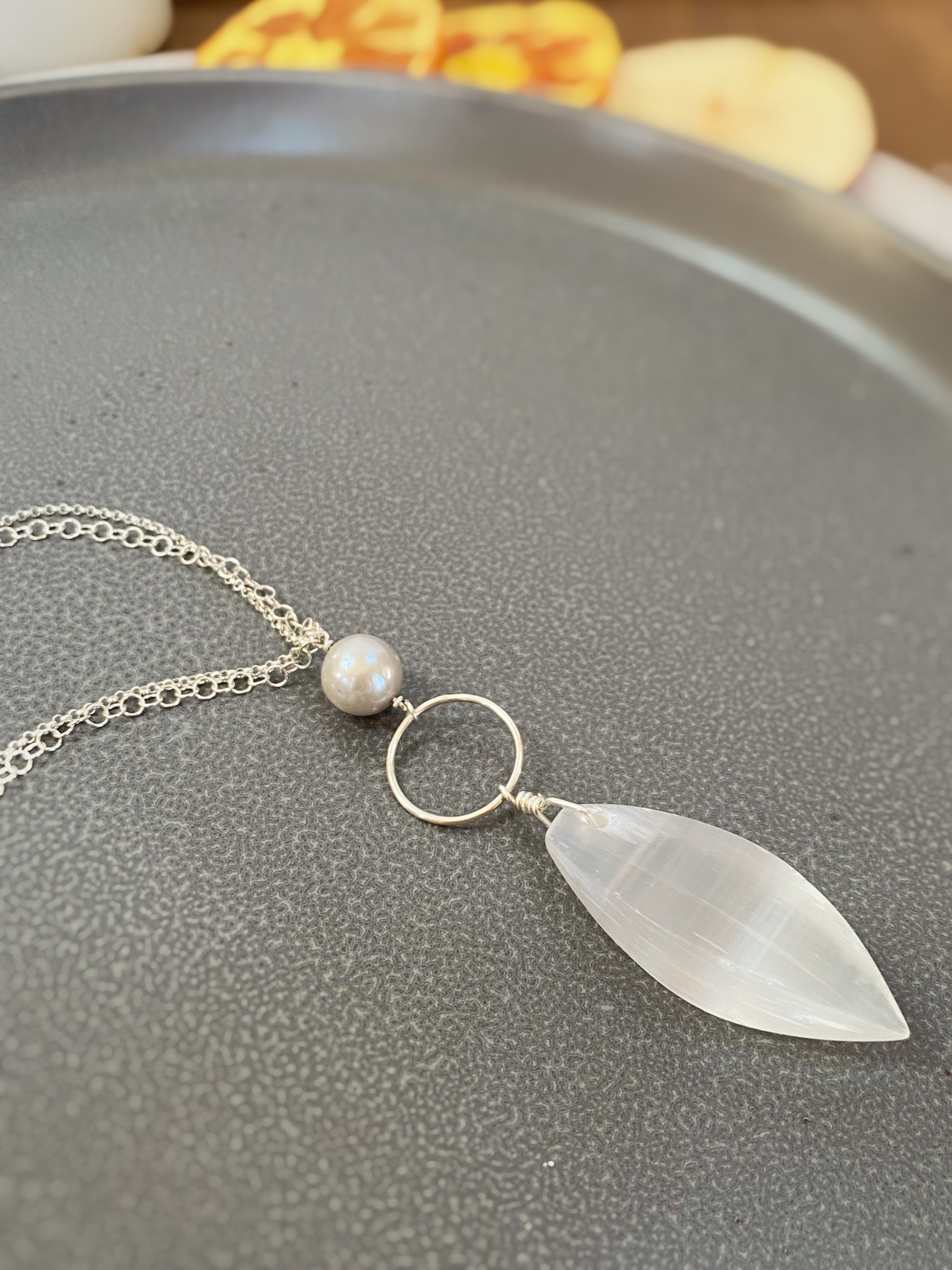 25" long, Selenite point, 10mm grey Freshwater Pearl, sterling silver hoop, wire chain, and ear wires.