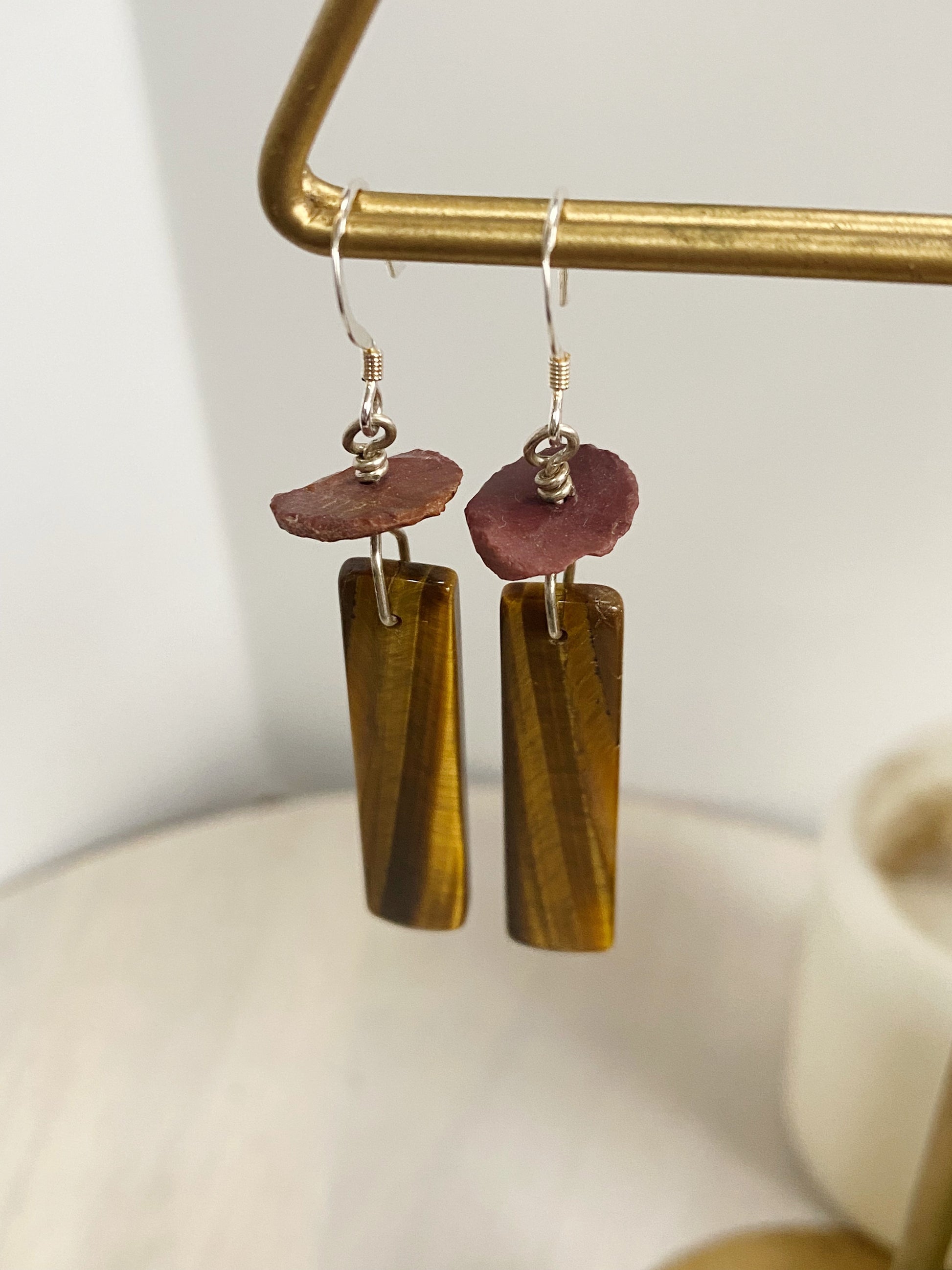 2.5" long, Tiger Eye bar, Moukite Jasper discs, sterling silver wire and ear wires.