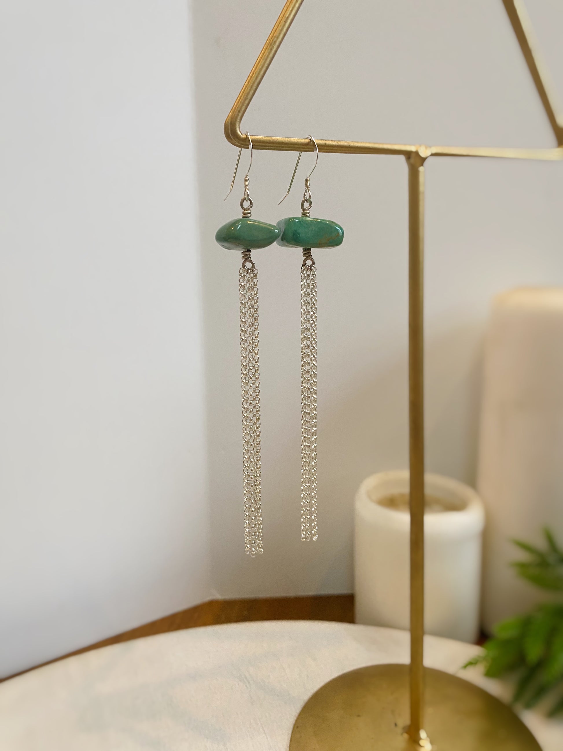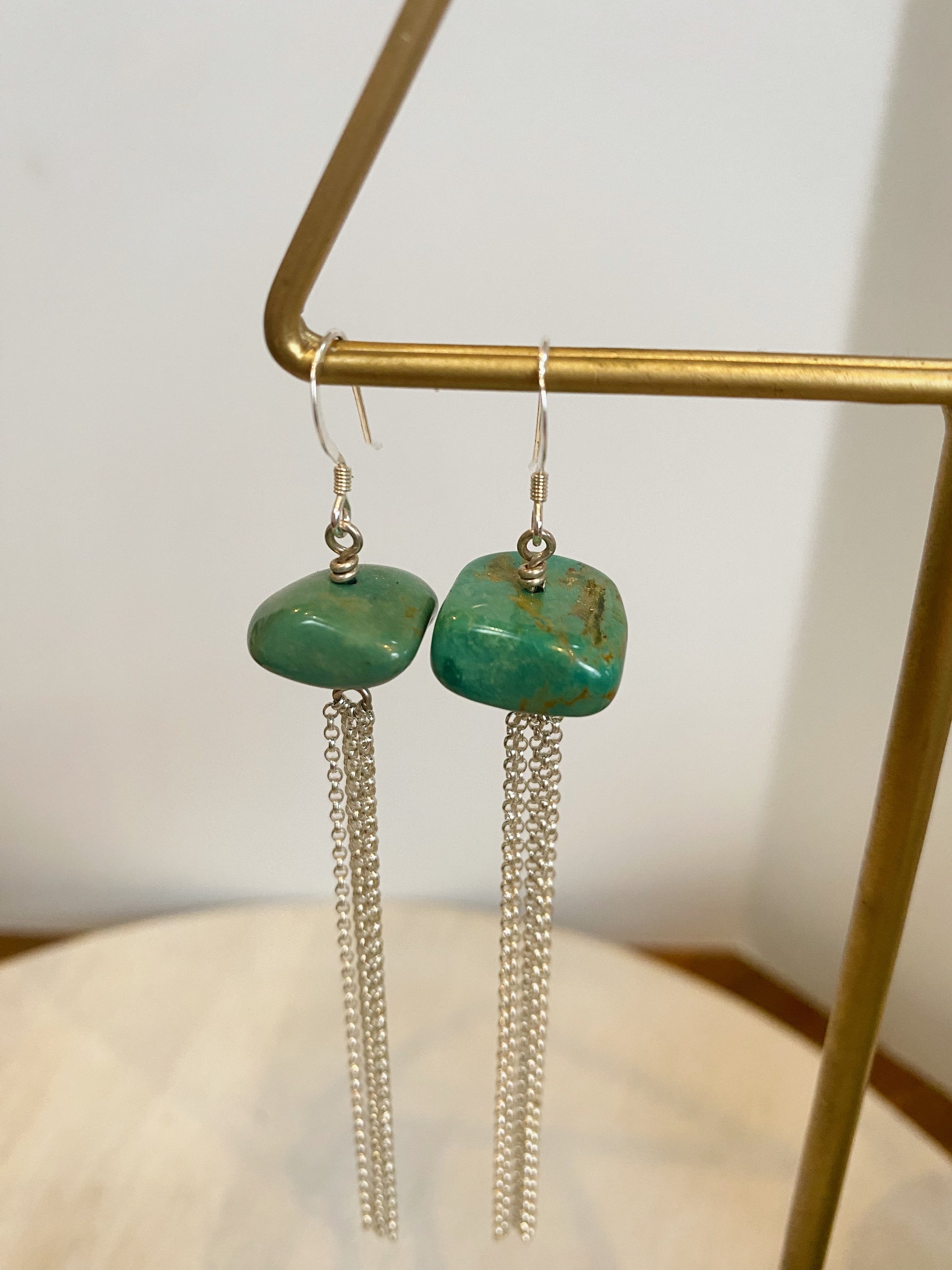 4.25” long, Turquoise chunks, sterling silver chain, wire, & ear wires.