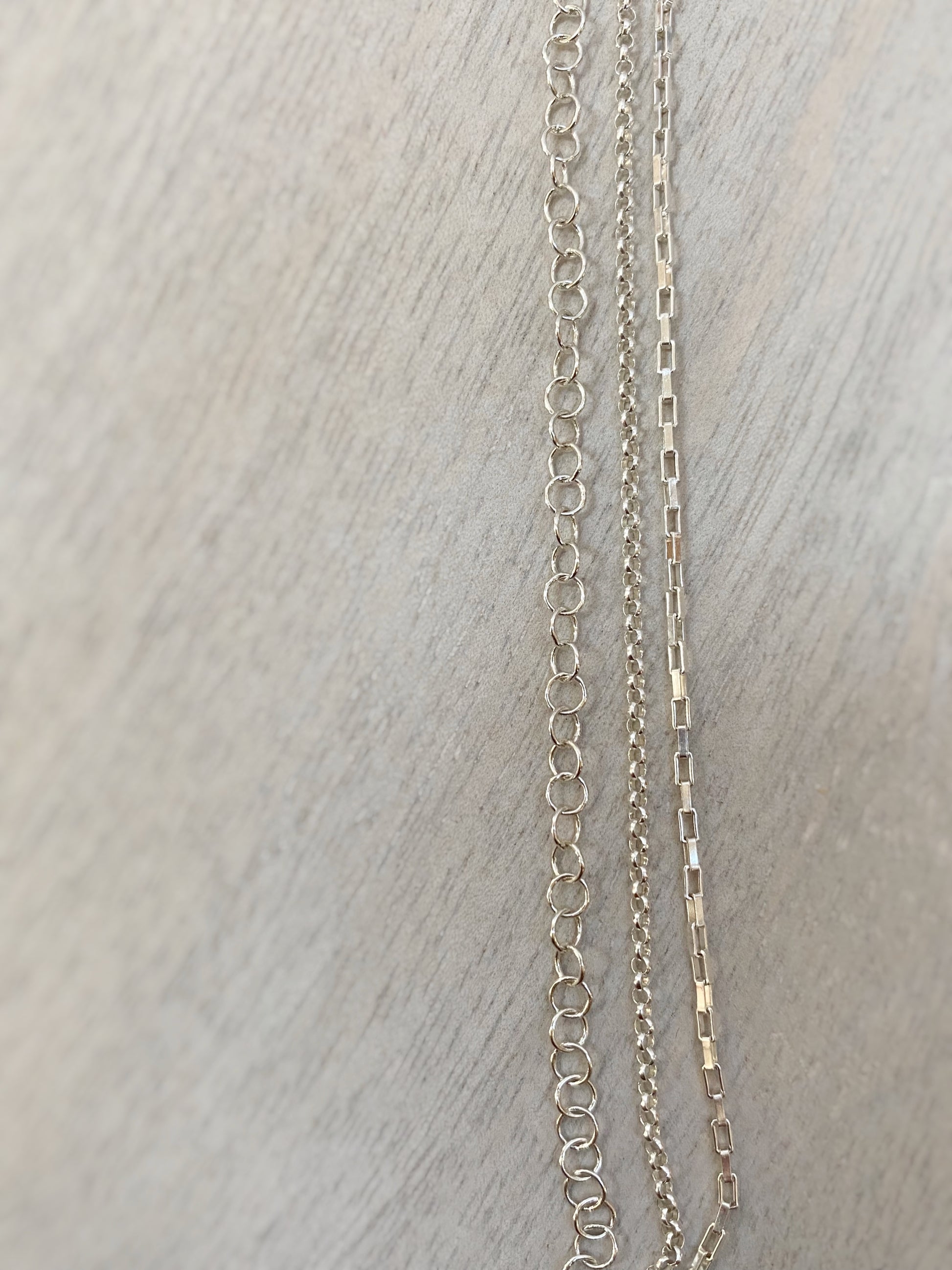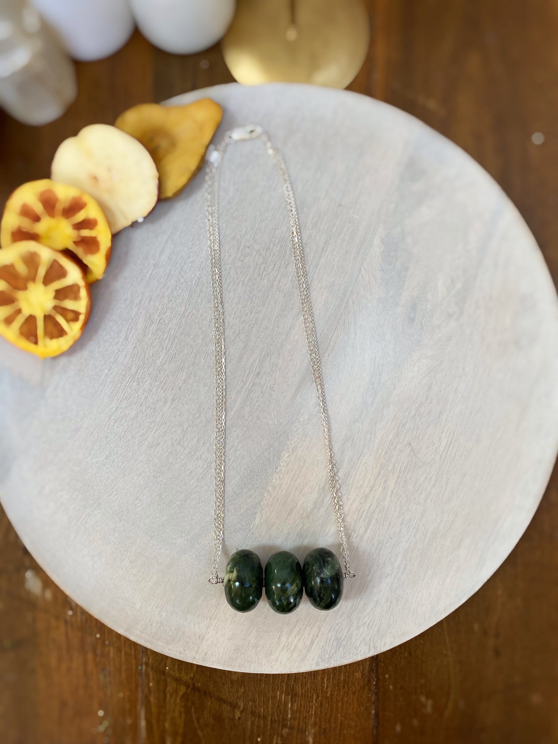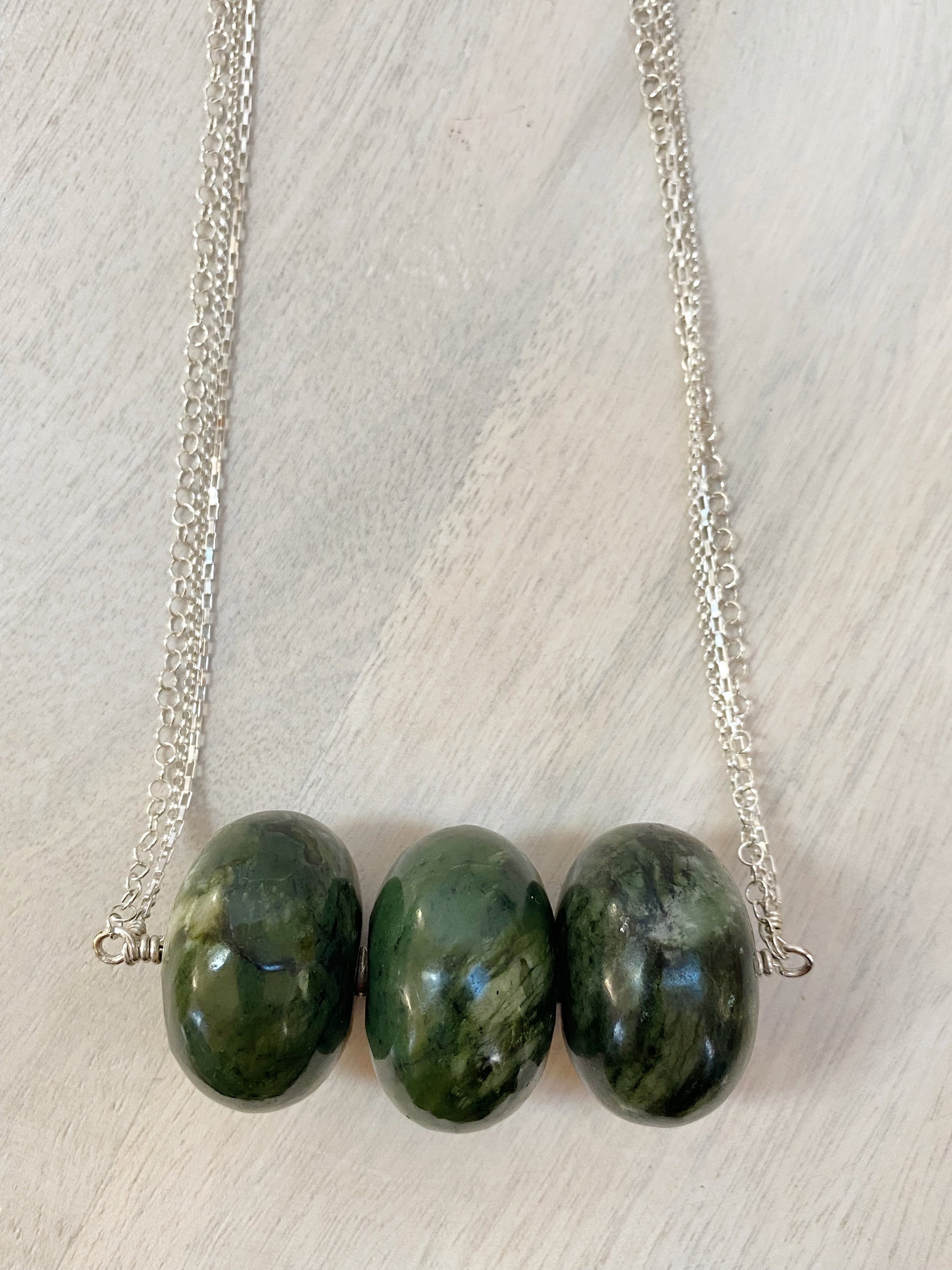 23.5" long, XL Jade rondelles, sterling silver chain (box & rolo), wire, and clasp.